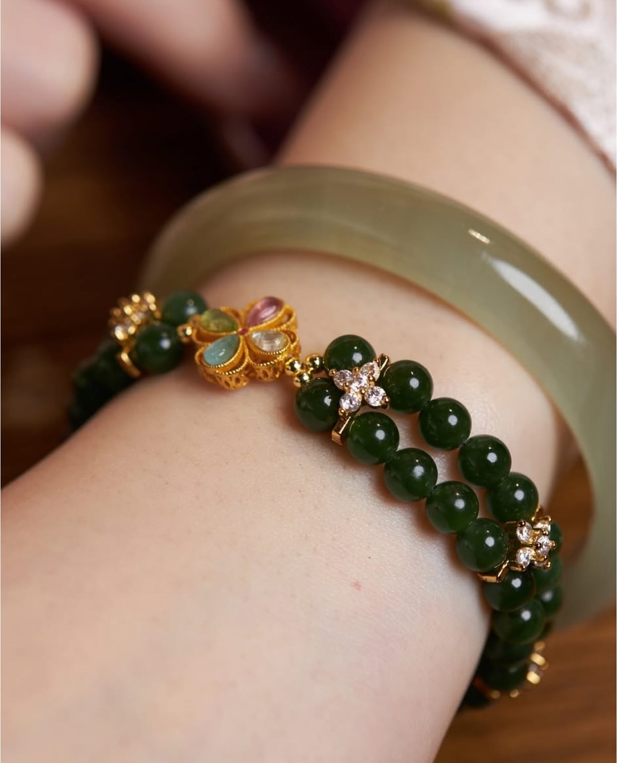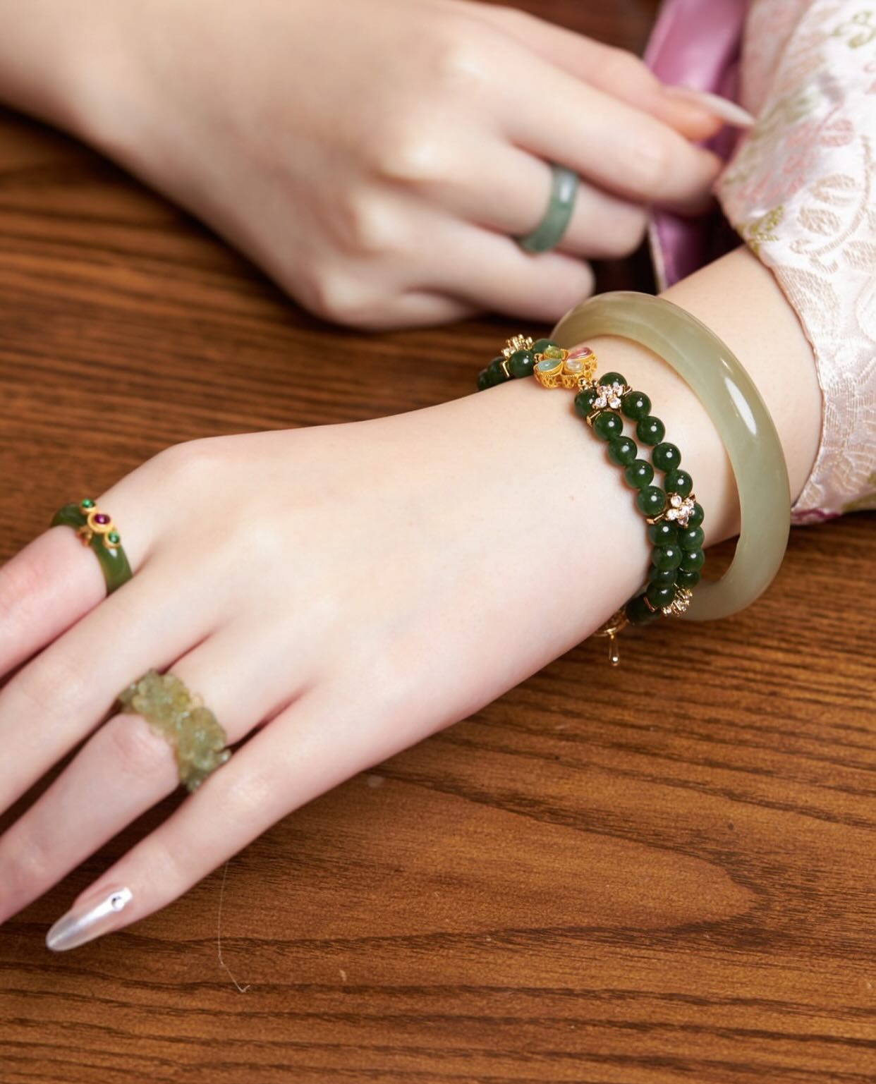Set trang sức gồm vòng tay ngọc Hòa Điền, nhẫn ngọc bích, và nhẫn tú ngọc hoa mận – là một lựa chọn đầy tính thẩm mỹ cho những ai yêu phong cách sang trọng mà vẫn giữ được nét nền nã, tinh tế.